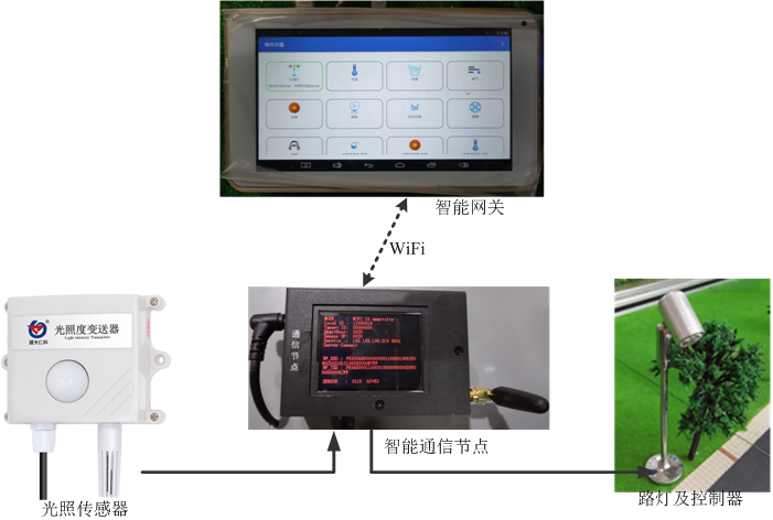 (1)路燈控制系統(tǒng):由智能通信節(jié)點(diǎn)及外圍驅(qū)動(dòng)電路板、路燈、光照傳感器組成。智能通信節(jié)點(diǎn)實(shí)時(shí)采集光照度,通過無線通信方式傳輸至網(wǎng)關(guān)。結(jié)合網(wǎng)關(guān)應(yīng)用程序,可以實(shí)現(xiàn)路燈開關(guān)控制、環(huán)境光照度定時(shí)采集,設(shè)置光照傳感器與路燈控制器的聯(lián)動(dòng)策略,根據(jù)光照強(qiáng)度,自動(dòng)控制路燈開關(guān);同時(shí)將光照度數(shù)據(jù)、路燈開關(guān)狀態(tài)上傳到云平臺(tái)進(jìn)行可視化展示,遠(yuǎn)程路燈控制。
