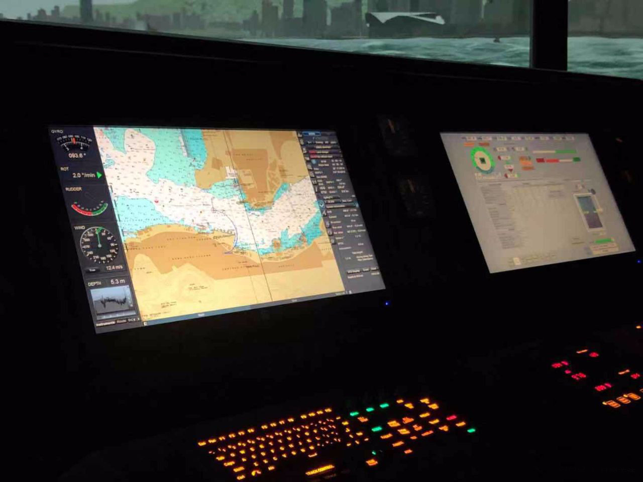 模擬器上的ECDIS滿足IMO/IHO關(guān)于ECDIS系統(tǒng)的性能指標(biāo)要求,顯示系統(tǒng)和實(shí)船設(shè)備一致,提供獲得CCS形式認(rèn)可的產(chǎn)品,能使用IHO授權(quán)的S57 格式海圖、顯示系統(tǒng)應(yīng)能夠使用官方矢量海圖。ECDIS可進(jìn)行海圖顯示、海圖作業(yè)、海圖改正、定位與導(dǎo)航、航海信息咨詢、雷達(dá)圖像疊加或雷達(dá)跟蹤目標(biāo)的疊加、航線設(shè)計(jì)、航路監(jiān)視、航行記錄、避礁石、防擱淺和航跡保持等功能。如圖5: