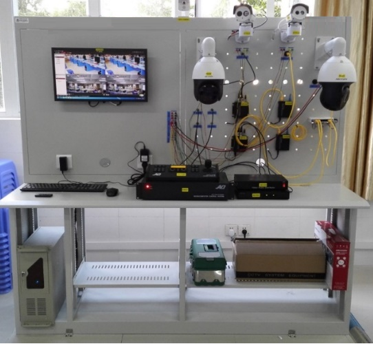 本實訓平臺的實現(xiàn)效果如圖1所示,交通視頻處理實驗操作臺整體采用優(yōu)質(zhì)冷軋鋼板作為主體結(jié)構(gòu),臺面防靜電,面板配備各種固定安裝套件以方便嵌入掛鉤進行實驗設備的安裝固定和穿線維護。實驗臺上能夠搭建的實驗儀器囊括了歷代視頻監(jiān)控攝像機,包括第一代的模擬視頻監(jiān)控系統(tǒng)(CCTV),第二代的基于“PC+多媒體卡”數(shù)字視頻監(jiān)控系統(tǒng)(DVR),第三代的完全基于IP網(wǎng)絡視頻監(jiān)控系統(tǒng)(IPVS),第四代的是目前正在快速發(fā)展的基于移動互聯(lián)、云計算、云存儲等新技術的視頻監(jiān)控系統(tǒng),這些設備既可以收納到實驗臺的抽屜中,也可以靈活地安裝固定在面板上。