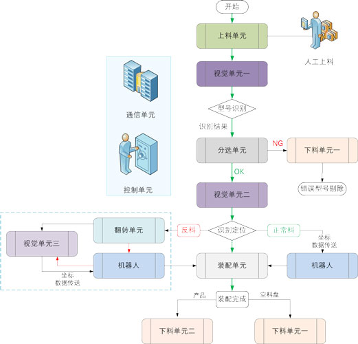 進(jìn)行來料抓取、反料翻轉(zhuǎn)、良品裝配、成品下料、視覺導(dǎo)航等。