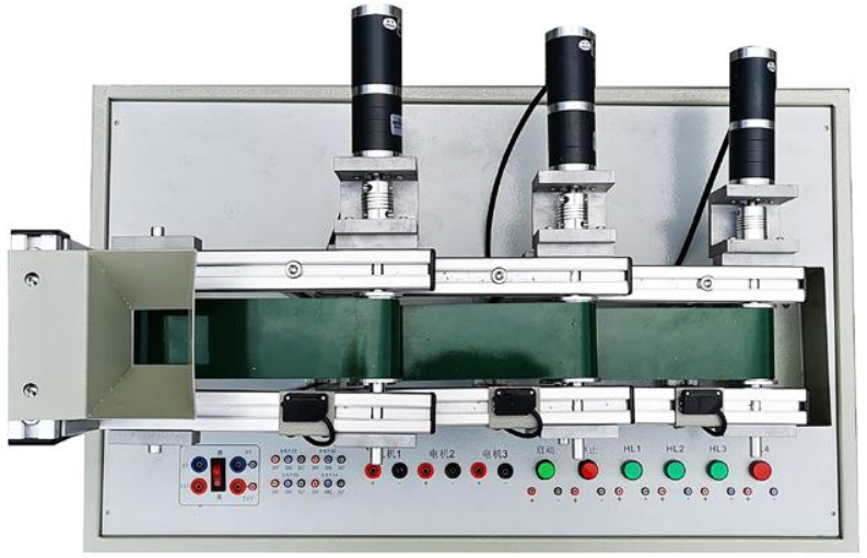 LGPFZC-1自動(dòng)送料裝車實(shí)訓(xùn)模型系統(tǒng)是用于物料輸送的流水線設(shè)備,主要是用于煤粉、細(xì)砂等材料的運(yùn)輸。本實(shí)訓(xùn)模型通過三臺(tái)電機(jī),三個(gè)傳送帶、料斗、小車模擬車斗)的配合,有效地完成物料的運(yùn)送、故障停止等功能。三臺(tái)電機(jī)控制三節(jié)傳送帶運(yùn)輸,電磁鐵YA控制料斗下料與否,傳感器ac檢2測(cè)運(yùn)料小車空滿;K1、K2、K3分別為電機(jī)M1,M2、M3故障設(shè)置開關(guān)。