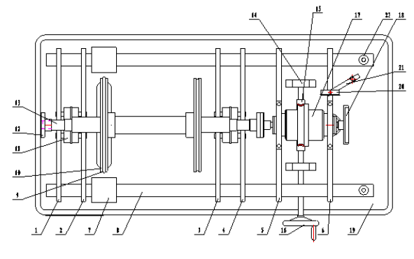 1、電機(jī),2、電機(jī)基座,3、實(shí)驗(yàn)臺平臺,4、測速盤,5、彈性聯(lián)軸器,6、測速傳感器,7、轉(zhuǎn)子軸,8、平衡盤,9、差速器,10、表?xiàng)U,11、百分表,12、補(bǔ)嘗盤,13、彈簧,14、蝸桿。