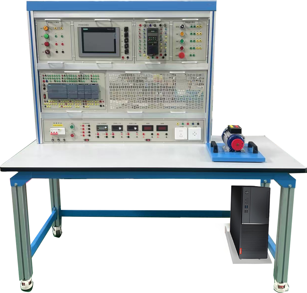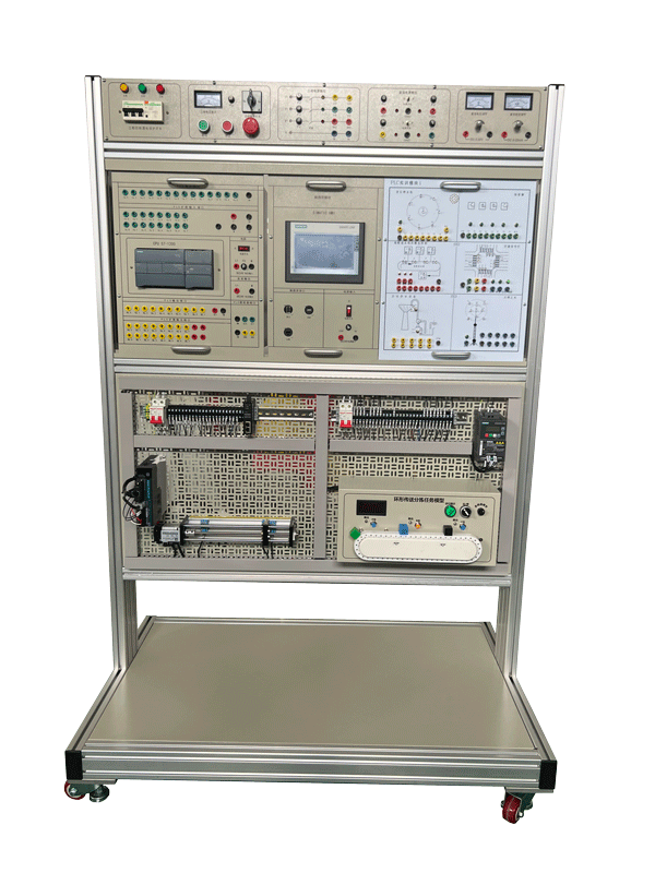 一 、技術指標 1、采用鋁合金框架與網孔板組合成立式實訓展板結構形式,有腳輪。 2、實訓臺尺寸為 1800 mm(高)800 mm(寬)465 mm(底座深)。 3、實訓臺上安裝西門子...