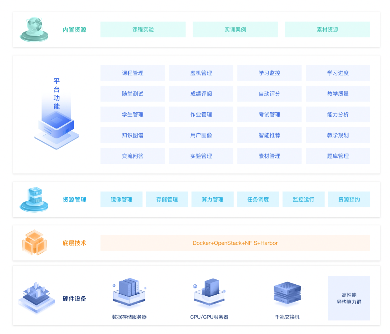 一、建設(shè)方案 高校信創(chuàng)實(shí)驗(yàn)室主要包括數(shù)智化實(shí)踐教學(xué)平臺(tái)和信創(chuàng)課程資源。 數(shù)智化實(shí)踐教學(xué)平臺(tái)采用國產(chǎn)化技術(shù),實(shí)現(xiàn)云計(jì)算資源的集中共享、統(tǒng)一調(diào)度管理的技術(shù)創(chuàng)...
