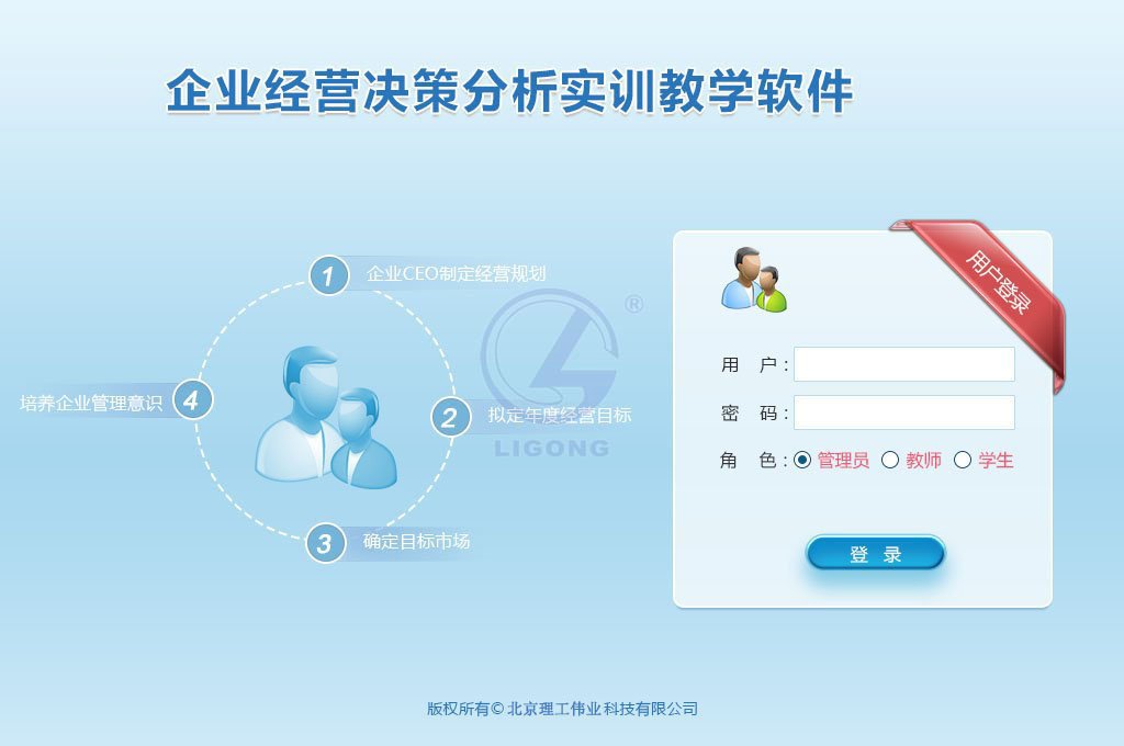 一、產(chǎn)品定位 《 企業(yè)經(jīng)營決策分析實(shí)訓(xùn)軟件 》是為滿足工商管理專業(yè)學(xué)生完成專業(yè)課程的學(xué)習(xí)后開展綜合實(shí)訓(xùn)或校內(nèi)實(shí)習(xí)的需求而研發(fā)的綜合決策類教學(xué)軟件。軟件以比...