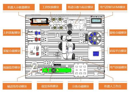 工作臺整體由兩個基礎(chǔ)臺拼接而成,更具空間靈活,拆卸方便等特點。臺面采用標(biāo)準(zhǔn)鋁型材,機(jī)器人 及功能模塊可根據(jù)需求改變布局位置,所有功能模塊采用手?jǐn)Q螺栓方式固定,可實現(xiàn)無工具快速拆裝與更 換。每個模塊電氣部分配置了獨立的電氣接線盒和快速航插,可實現(xiàn)模塊整體機(jī)械和電氣快速安裝部署, 還可根據(jù)需求更換或添加功能模塊進(jìn)行功能擴(kuò)展。