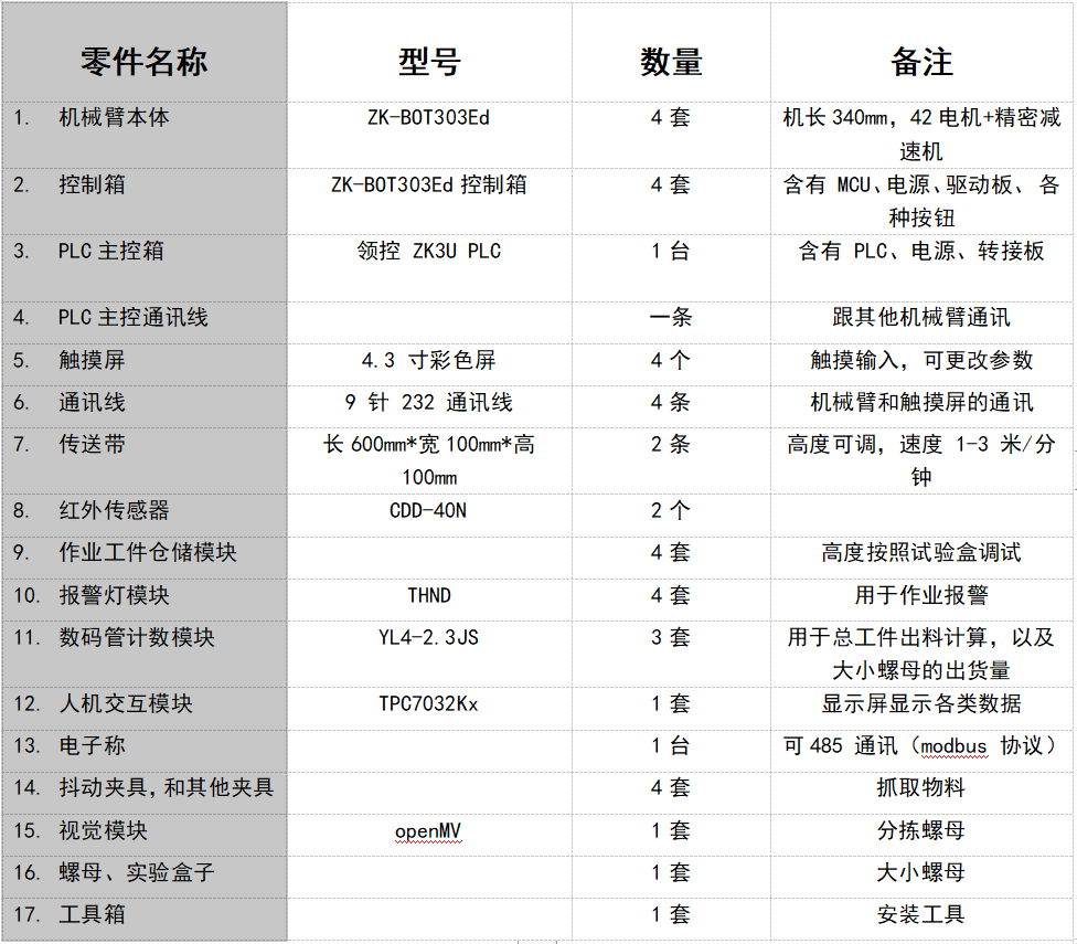 模塊采用ZK-BOT303Ed教學(xué)款機械臂、底座、末端手爪工具、機器人控制系統(tǒng)和示教器組成。