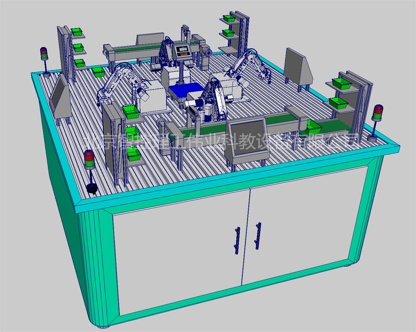 系統(tǒng)各模塊放置于鋁型材實訓(xùn)臺上,實訓(xùn)臺主架由鈑金與鋁型材搭建,兩側(cè)安裝擋板,采用半封閉式結(jié)構(gòu)加強空氣流通以便散熱,邊角圓弧處理。前部亞克力材質(zhì)對開門,安全操作方便,外形規(guī)整大方。實訓(xùn)臺底部配置剎車滾輪和可調(diào)支腳,方便支撐與移動。系統(tǒng)抽展式控制部分水平配滑道放置在實訓(xùn)臺中央,對門打開時,控制部分可拉出。底部形態(tài):可調(diào)支腳與滾輪。
