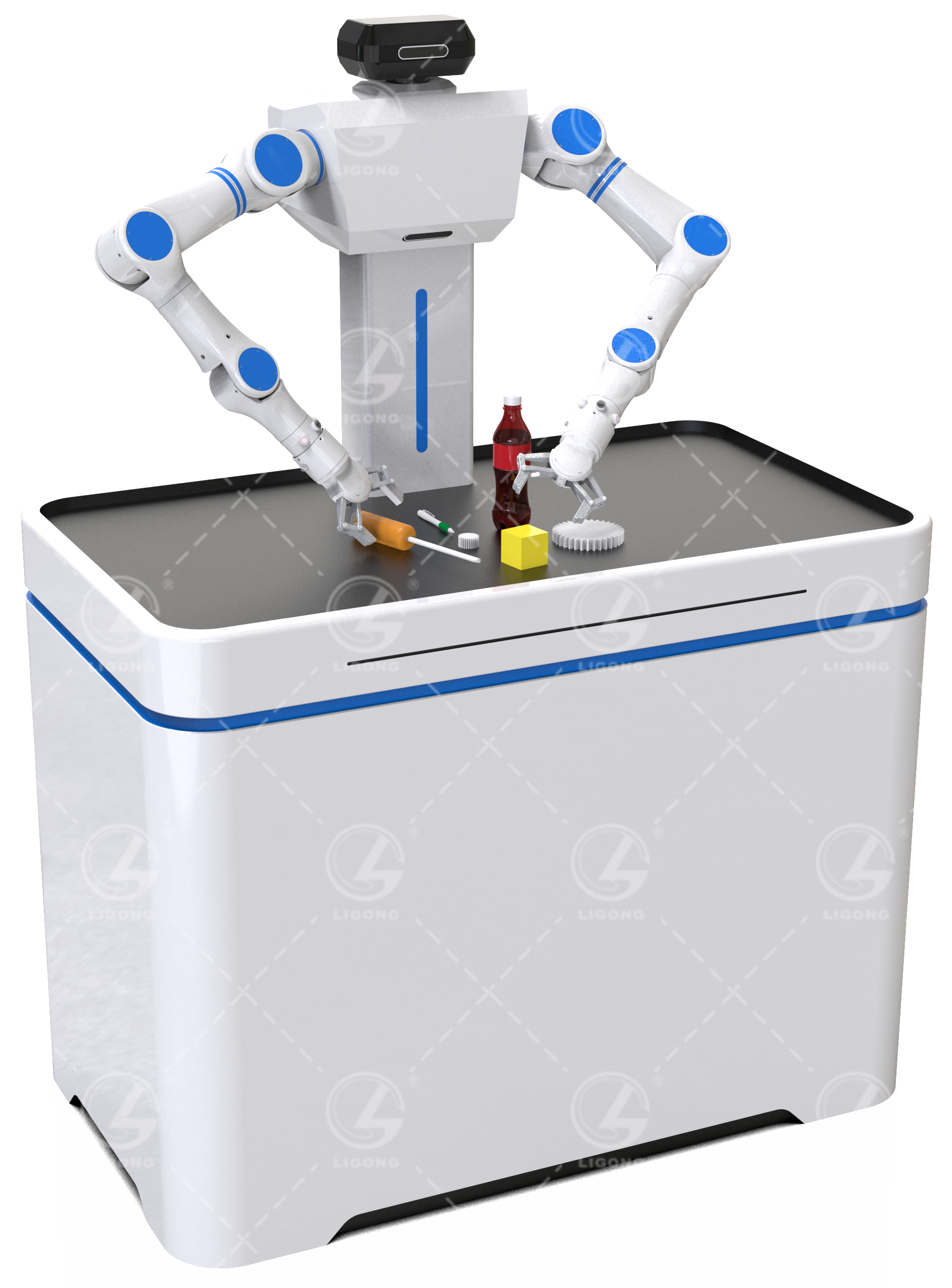 平臺以一臺人形機器人的上半身為主體結構,通過將其安裝在操作平臺上,可以面向生產或生活場景,以高度擬人的形態(tài)開展多樣化的應用,為具身智能的前沿研究開辟了全新的創(chuàng)新平臺。平臺通過深度相機實時獲取作業(yè)區(qū)域內的三維信息,結合內置的中央運算單元,以及部署的大模型技術,能夠準確識別物體的形狀、位置和姿態(tài),從而控制雙臂進行高精度的仿人作業(yè)。除此之外,該系統(tǒng)還內置強化學習算法,并配置遙操作系統(tǒng),可用于協(xié)同控制算法、多模態(tài)感知與決策、自主進化等具身智能領域的先進算法開發(fā)與驗證。