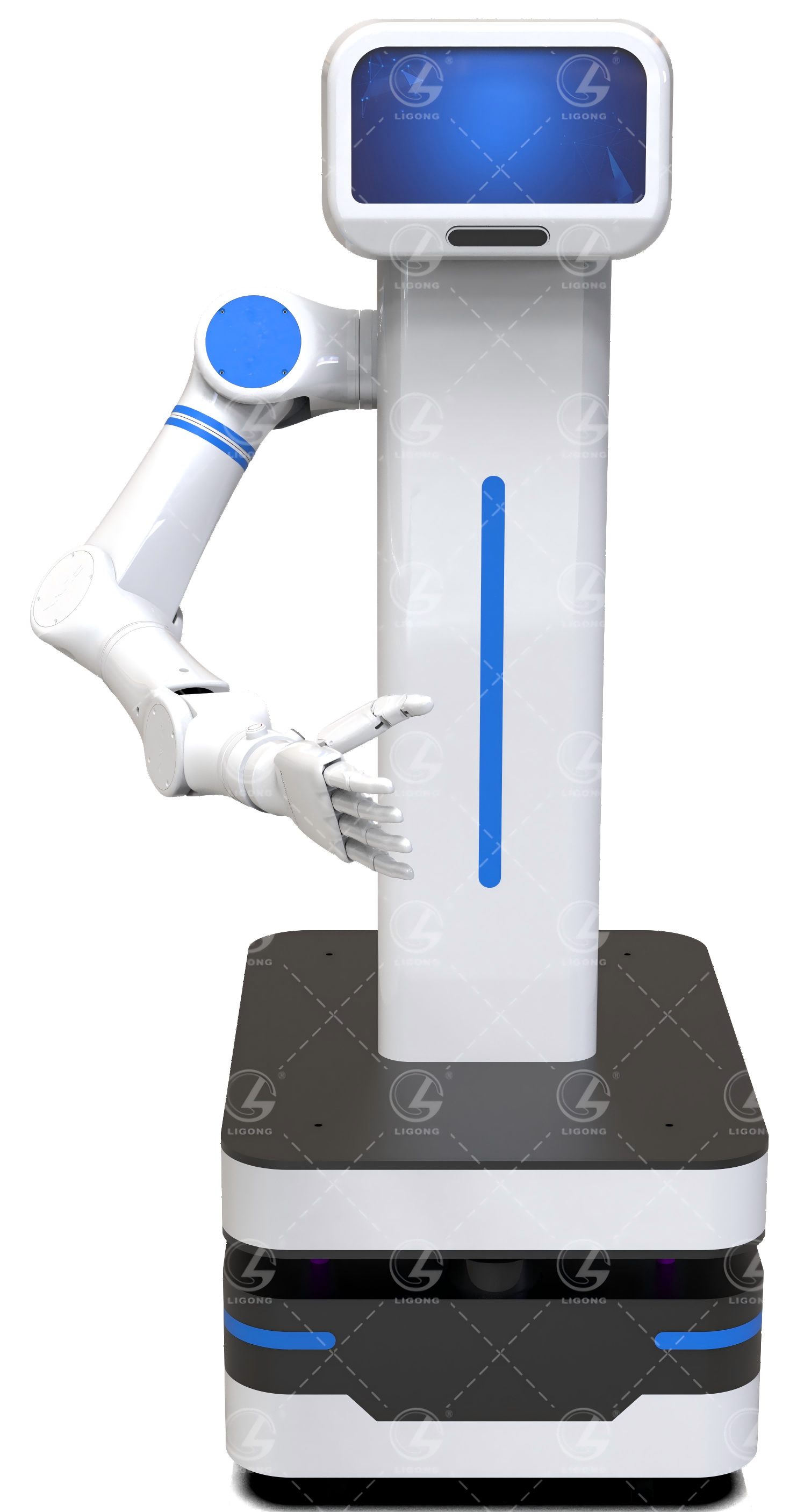 智能服務機器人融合了移動機器人的自主導航能力與七軸人形手臂的高度擬人化能力,可以面向服務場景開展豐富的應用。在結構上,采用中央運算單元進行推理與決策,并通過配備的深度視覺系統(tǒng)、麥克風陣列及激光雷達構成多模態(tài)環(huán)境感知網絡,可以感知人體位置、距離、手勢動作、聲音特性等多種信息,從而實現(xiàn)與用戶的高度自主交互。產品適用于展廳講解、商超導覽、校園接待等應用場景。