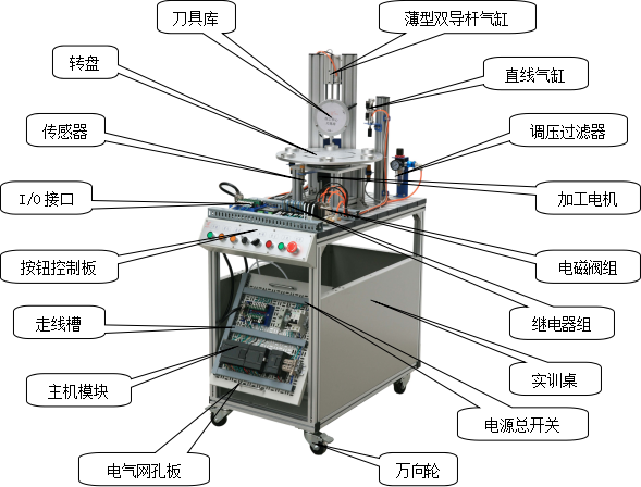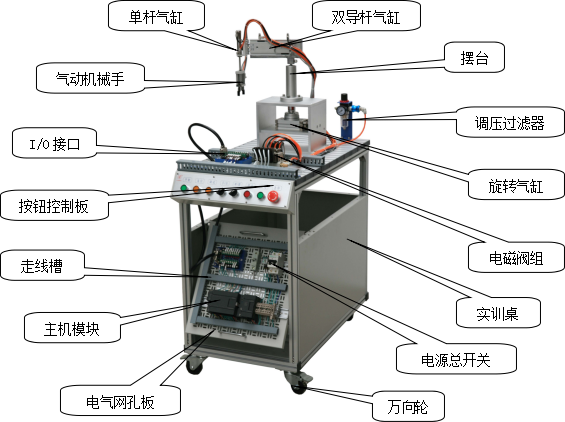 該系統(tǒng)上使用了大量的氣動(dòng)元件,包括多種電控氣動(dòng)閥、多種氣動(dòng)缸、氣動(dòng)夾爪、真空吸盤、真空發(fā)生器、過濾減速閥等。在學(xué)習(xí)這些氣動(dòng)元件時(shí),不但可以單獨(dú)學(xué)習(xí)每一種分離元件,而且還可以在學(xué)習(xí)時(shí)了解各種氣動(dòng)元件之間,以及氣動(dòng)元件與其它元件之間,如何配合起來并協(xié)調(diào)進(jìn)行工作的。