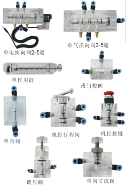3、透明氣動與PLC實訓(xùn)裝置各個透明氣動元件成獨立模塊,且裝有帶彈性卡扣底板,可方便、隨意地將元件安放在實訓(xùn)面板(面板帶“T”溝槽形式的鋁合金型材結(jié)構(gòu))上。回路搭接采用快換接頭,布局靈活,拆接方便快捷。