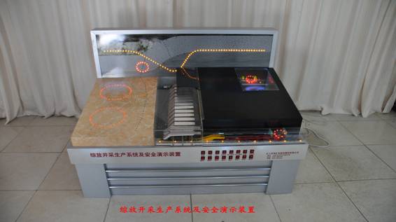 LG-MZC03型 綜采工作面及頂板管理安全演示裝置直觀反映出綜采工作面生產(chǎn)工藝、巷道布置、通風(fēng)系統(tǒng)、綜合防塵、隔爆設(shè)施、瓦斯抽放、瓦斯監(jiān)測、運(yùn)輸系統(tǒng),利用聲、光、電、機(jī)械傳動技術(shù)顯示工藝流程及頂板巖層的移動及應(yīng)力分布。直觀體現(xiàn)割煤、移架和推溜。通過支架的移動,展現(xiàn)初次放頂、初次來壓、周期來壓、工作面前后方應(yīng)力的分布形態(tài),上覆巖層的移動特征及垮落帶,裂隙帶、沉降彎曲帶“三帶”分布規(guī)律和地表沉降規(guī)律。利用聲、光、電、機(jī)械傳動顯示工藝流程。