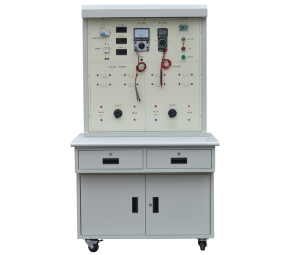 (1)實訓(xùn)臺主體部分采用全鋼結(jié)構(gòu),鋼板亞光噴塑,美觀耐用,臺面采用鋁塑板印制而成,整個實訓(xùn)臺由漏電保護(hù)開關(guān)、熔斷器、開關(guān)電源、數(shù)顯計時器、智能刷卡啟動電路板、單相交流調(diào)壓器、單相直流調(diào)壓器、交流接觸器、數(shù)字電壓表、數(shù)字電流表、指針萬用表、數(shù)字萬用表、照明日光燈、各種開關(guān)、各種電阻和安全接線柱等組成。