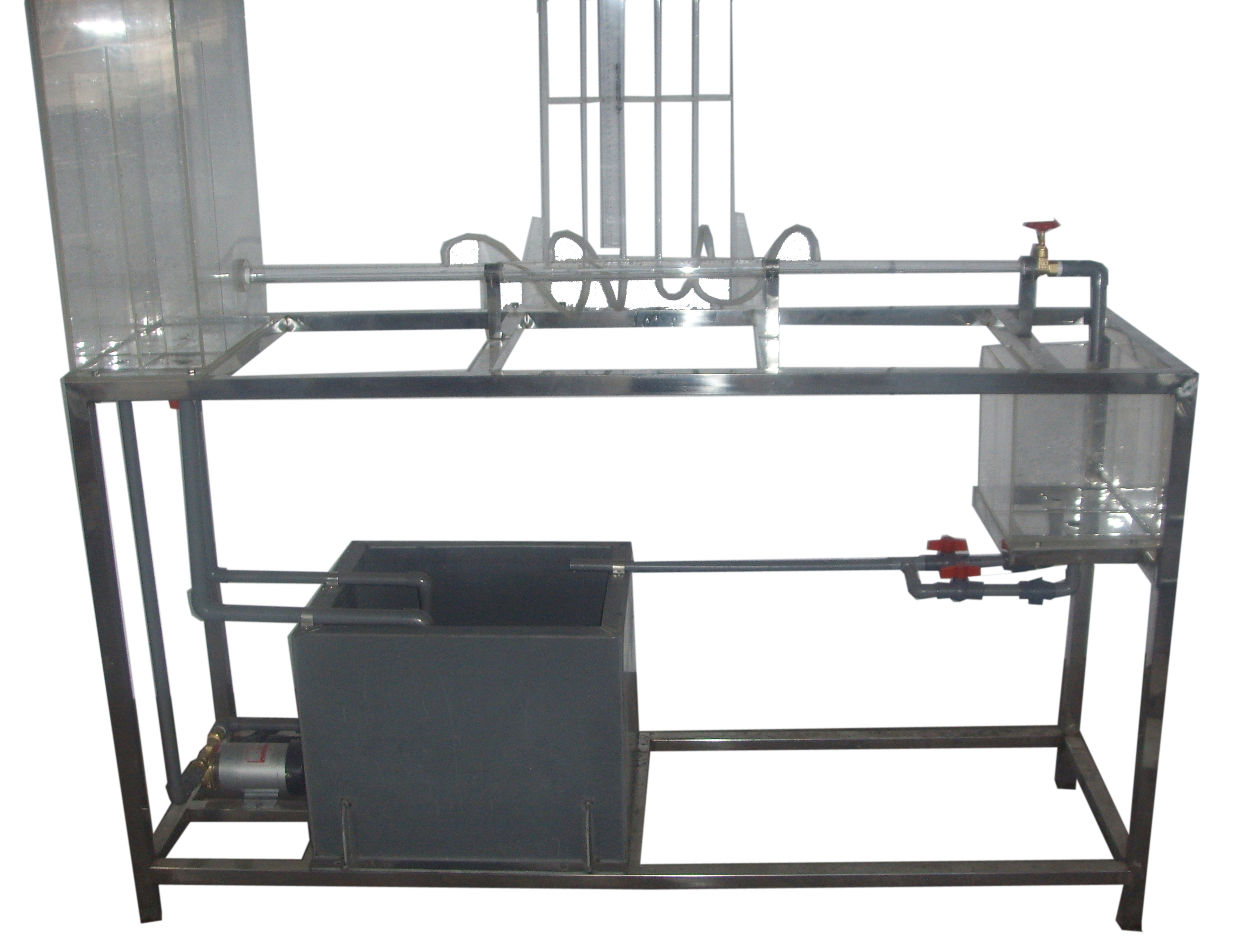 有機(jī)玻璃實(shí)驗(yàn)水箱、局部阻力管、測壓管、水泵、蓄水箱、計(jì)量水箱、刻度標(biāo)尺、秒表、玻璃溫度計(jì)、自循環(huán)裝置、閥門、不銹鋼框架。