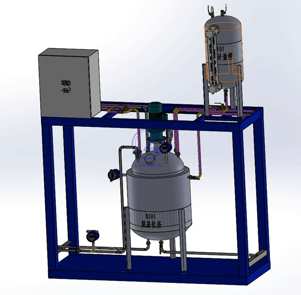 一、裝置特色 整套裝置由鋼制安裝框架、苯胺計量槽、亞硝酸鈉計量槽、冷凝器、重氮釜、仿真儀表、就地計算機操作臺、、就地智能儀表控制上位監(jiān)控軟件、外置配套...