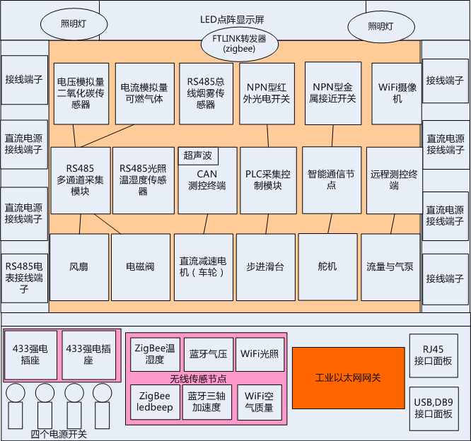 1、標(biāo)配網(wǎng)孔操作板、四組直流供電板、四組有線傳感器的供電通信板、六個無線傳感器節(jié)點、一個工業(yè)以太網(wǎng)網(wǎng)關(guān)、兩個無線強(qiáng)電控制插座、四種交直流電源按鈕、指示燈、點陣顯示屏等,為行業(yè)創(chuàng)新應(yīng)用提供硬件支持。