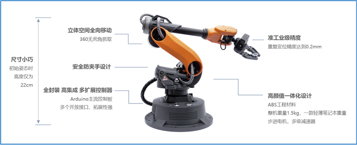 1、六軸桌面機(jī)械臂(含電源、USB接線、IDC通訊線、機(jī)械夾爪、筆夾、多功能控制器、使用說明書)×1
