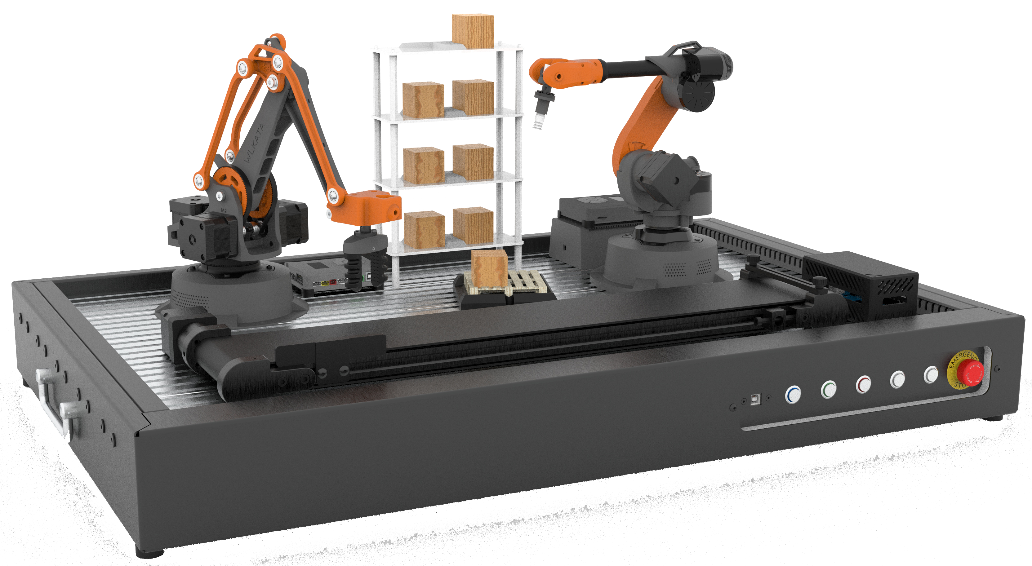 桌面六軸工業(yè)機器人*1、四軸桌面機器人*1、傳送帶套件*1、智能一體化底座*1、物流配件包*1