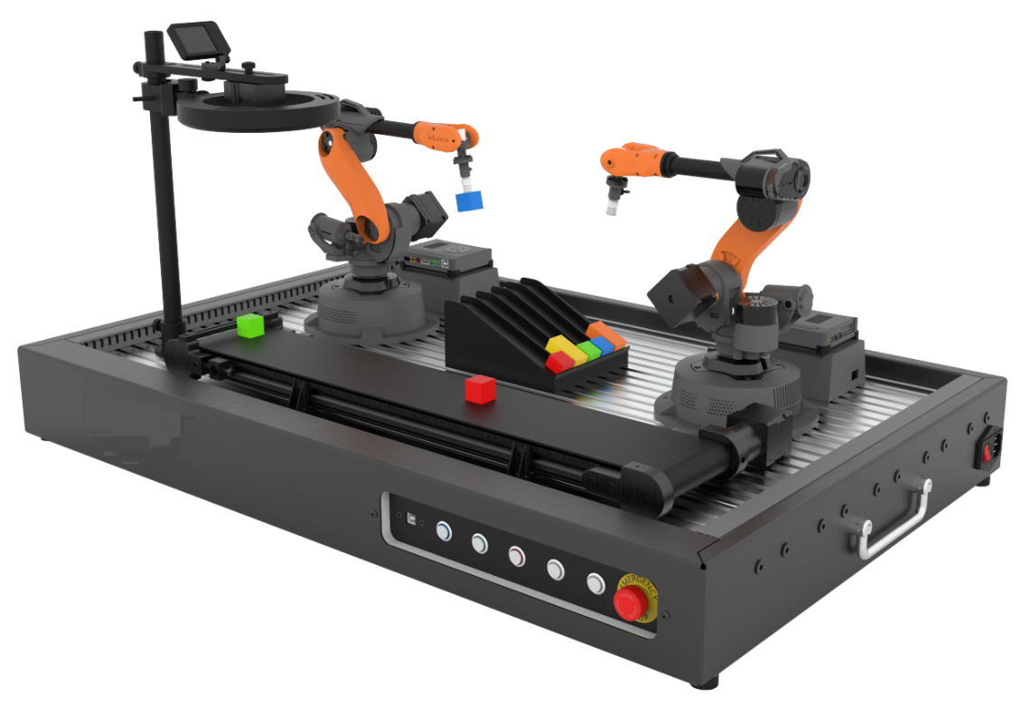 1、功能描述:產(chǎn)線由機(jī)械臂、傳送帶套件及AI視覺(jué)套件組成,沙盤(pán)模擬視覺(jué)系統(tǒng)與機(jī)械臂在工業(yè)自動(dòng)化中的配合協(xié)作。本產(chǎn)線可自動(dòng)化循環(huán)運(yùn)行,運(yùn)行時(shí)木塊滑臺(tái)上的傳感器判斷當(dāng)前位置是否有木塊,并控制機(jī)械臂隨機(jī)吸取一個(gè)顏色的木塊放置于傳送帶上,傳送帶將木塊運(yùn)送至視覺(jué)模塊下方,視覺(jué)模塊分析木塊的顏色及位置信息并控制左側(cè)的機(jī)械臂將木塊放置于滑臺(tái)的對(duì)應(yīng)位置,此過(guò)程循環(huán)往復(fù);