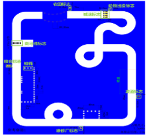 智能汽車賽道是PVC賽道,有黑白膠帶、藍(lán)色背景布、坡道、賽道元素標(biāo)志、錐桶等。