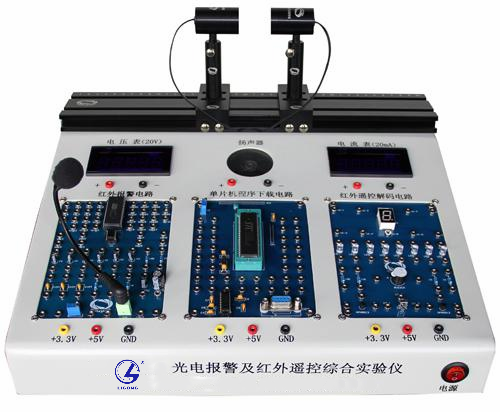我司自主研發(fā)的LG-CDJ01型光電報警及紅外遙控實驗儀具有兩大功能,一是光電報警系統(tǒng),通過感光器件(紅外接收管)把光信號轉(zhuǎn)換成電信號,控制數(shù)碼管的顯示以及報警電路,利用部分數(shù)字邏輯電路及單片機,實現(xiàn)在報警過程中顯示對應路數(shù)的功能。二是紅外遙控系統(tǒng)(遠程控制技術又稱為遙控技術,是指實現(xiàn)對被控目標的遙遠控制,在工業(yè)控制、航空航天、家電領域應用廣泛。紅外遙控是一種無線、非接觸控制技術,具有抗干擾能力強,信息傳輸可靠,功耗低,成本低,易實現(xiàn)等顯著優(yōu)點,被諸多電子設備特別是家用電器廣泛采用,并越來越多的應用到計算機中),該系統(tǒng)通過對紅外遙控器的解碼實現(xiàn)各種控制電路,如數(shù)碼管顯示控制、發(fā)光二極管發(fā)光控制、蜂鳴器開關控制等。本款儀器的設計采用可搭建電路組件的結(jié)構,從設計、安裝、搭建、調(diào)試等方面入手,全面提高學生的動手動腦能力和技術水平。